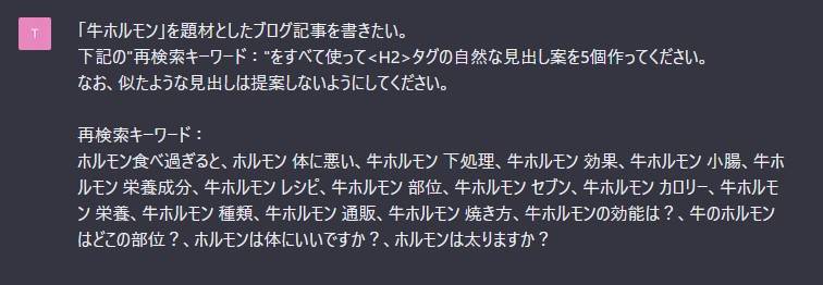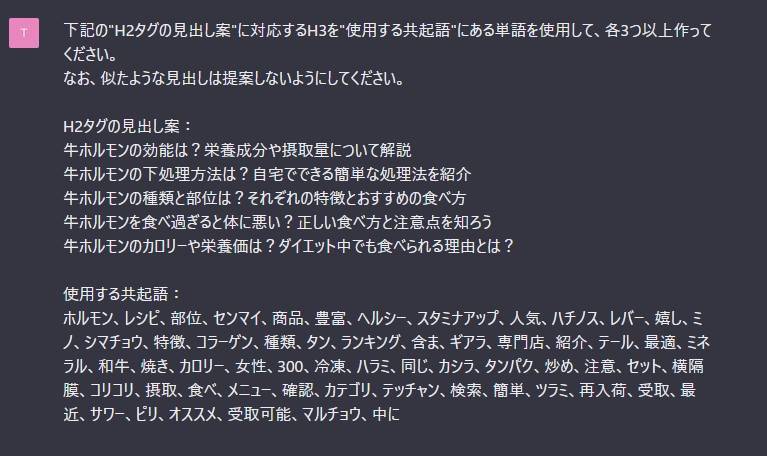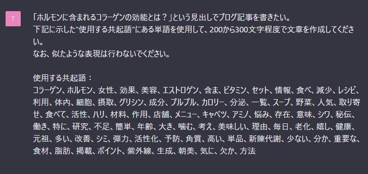 それでは、取得した共起語を使って、以下のようなプロンプトをChatGPTのフォームに入力します。