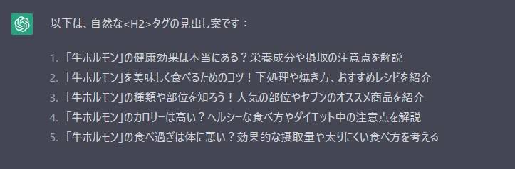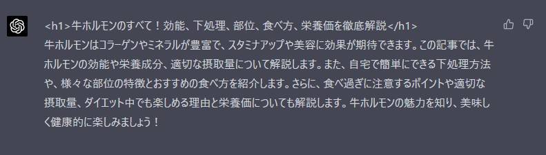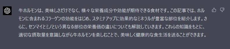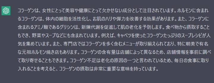 今までの流れを見て頂ければ、既に気づかれた方もいるかと思いますが、ただ単純に”「ホルモンに含まれるコラーゲンの効能とは?」について記事を作成しなさい”というプロンプトだけでは、ありきたりでつまらない文章を生成しがちなChatGPTですが、このようにキーワードや制限・条件をセットで命令するだけで、SEOで重要なキーワードも取り込みつつ、幾分マシな返答をさせることも可能になります。