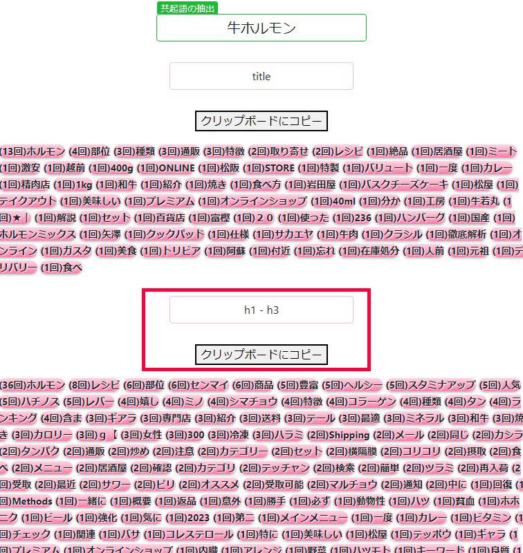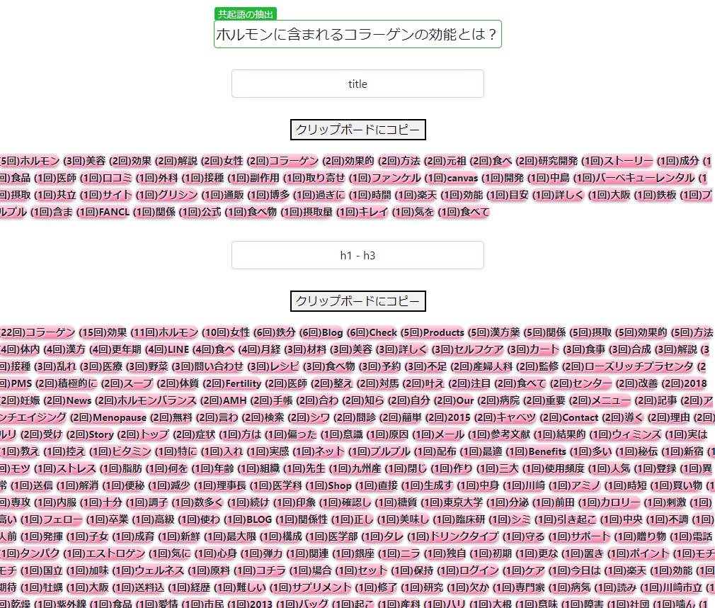 先程生成した<h3>をまずは1つだけチョイスして、コピペしたものをそのまま共起語ツールにぶち込みます。