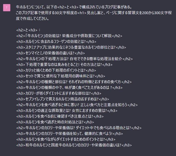 これらを、用いて<h1>と冒頭文をChatGPTに作ってもらいましょう。