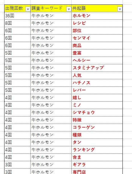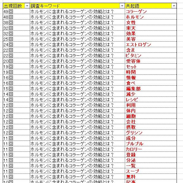さて、”ホルモンに含まれるコラーゲンの効能とは?”の”body”に出現する共起語は、1131個取得できました。