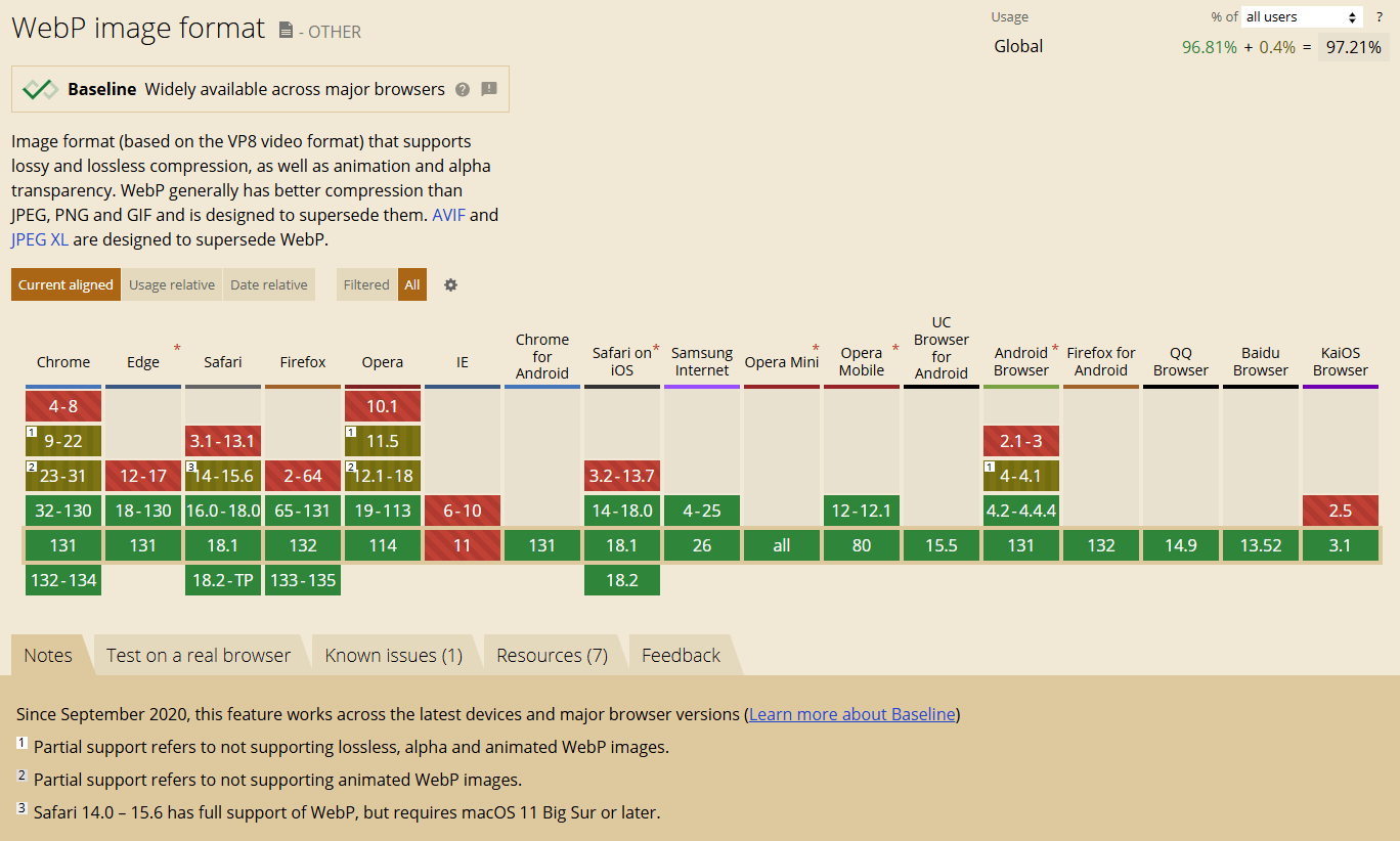 私は2019年頃からWebPの導入や導入提案を行ってきました。当時は対応ブラウザが限られており、SEO効果への期待もまだ懐疑的な状況でした。しかし現在では、主要なブラウザのほとんどがWebPに対応しており、その対応状況は大幅に改善されています。