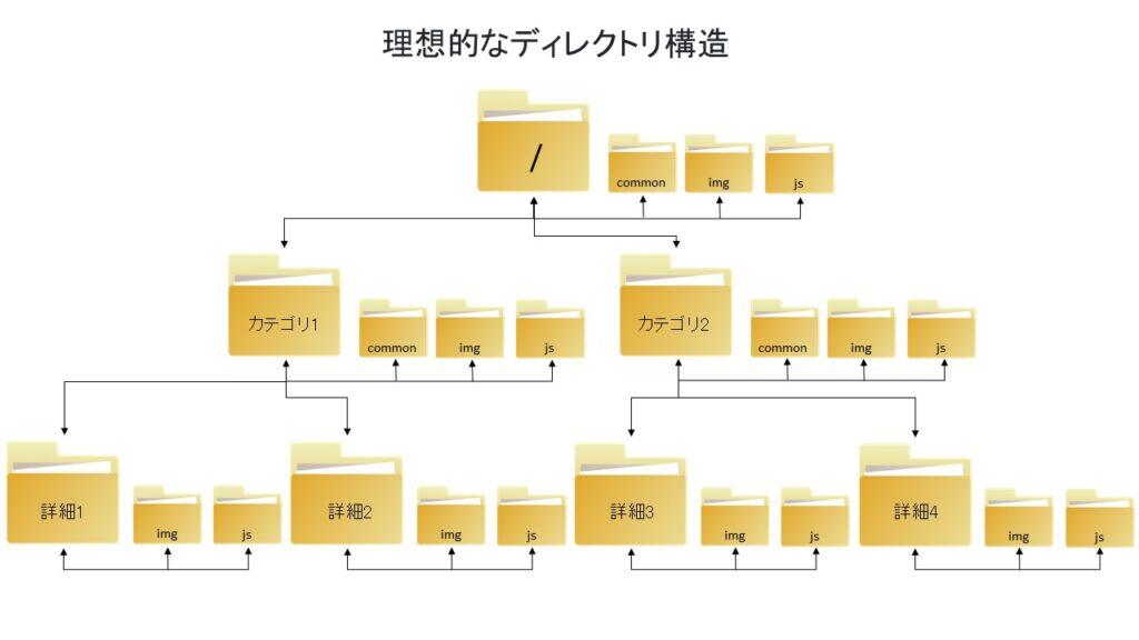 また、各ページで使用されている画像ファイルや設定ファイルをゴチャ混ぜに放り込んでいると、「この画像はいったいどの階層のどのページで使われているのか?」など、ファイルの役割が瞬時に判断しづらくなるといった問題もあります。