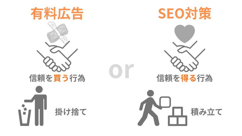 有料広告とSEO対策の違いを、「有料広告=信頼を買う行為」「SEO対策=信頼を得る行為」と考えるとわかりやすいかもしれません。