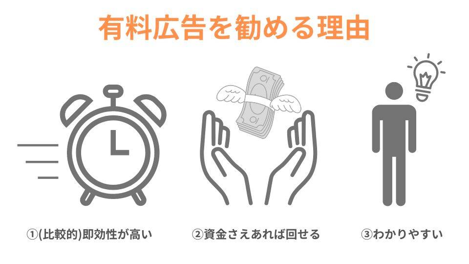 多くの方は最初にSEO対策へと目を向けがちですが、初期段階では有料広告を試すほうが無難な場合も多いです。