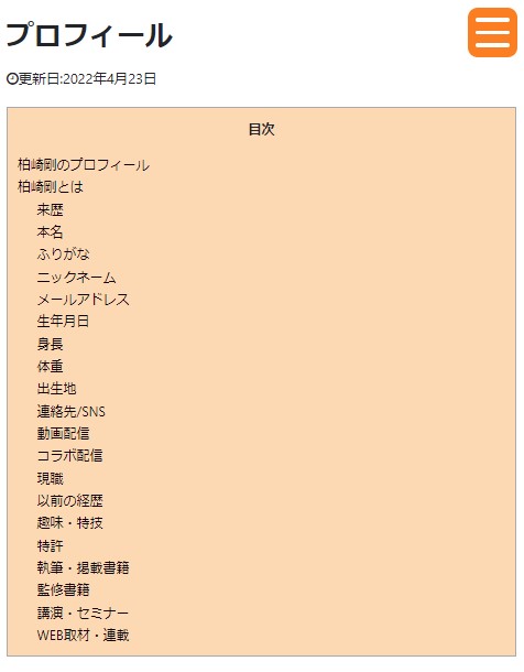 上のスクリーンショットは当サイトの「プロフィール」から抜粋した目次です。