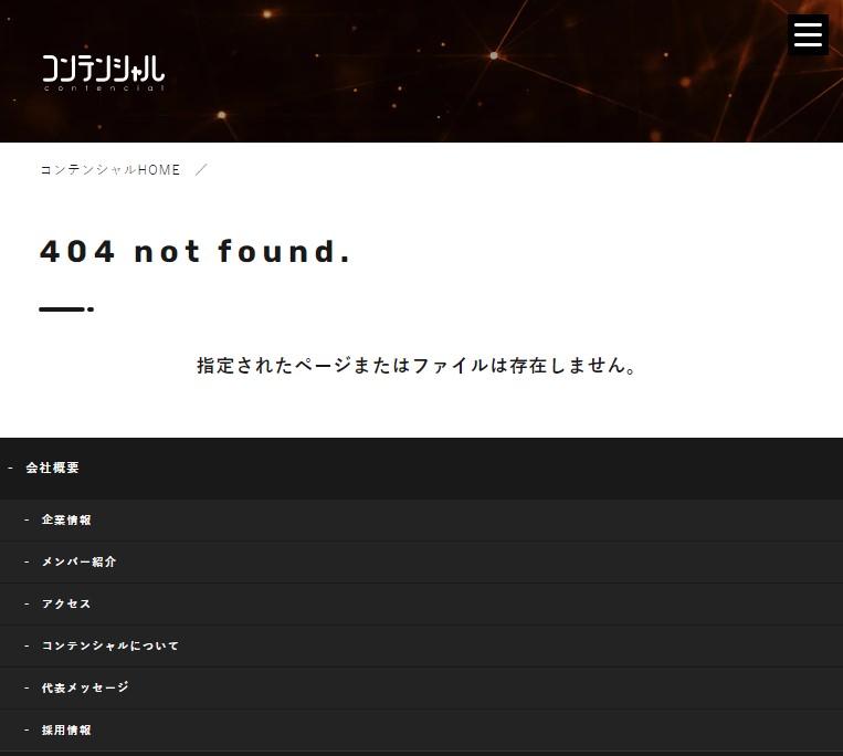 サンプルは、カスタム404ページを使って「指定されたページまたはファイルは存在しません」とメッセージで伝えた上で、各メニューからサイト内の別のページに移動しやすくしています。