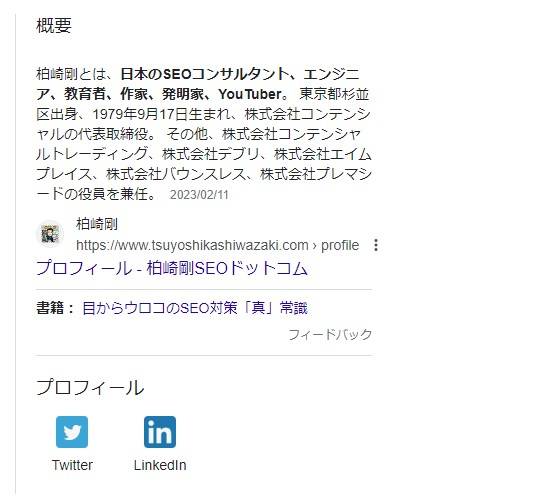 掲載されている情報は、会社名、住所、電話番号、営業時間、サイトリンク、その他詳細が一般的には含まれていり、人物のナレッジパネルにおいては、生年月日、経歴、出版物(作品)、受賞歴、SNS(YouTube、TikTok、Twitter等)やWikipediaへのリンクが掲載されることになります。