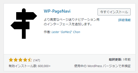 WordPressのダッシュボードから「プラグイン」→「新規追加」をクリックし、検索バーに「WP-PageNavi」と入力して検索します。見つけたら「今すぐインストール」をクリックしてインストールしてください。